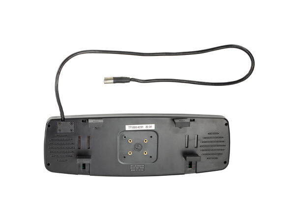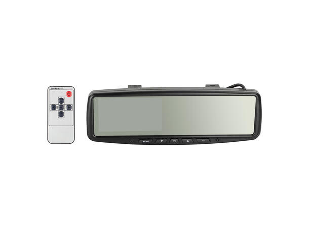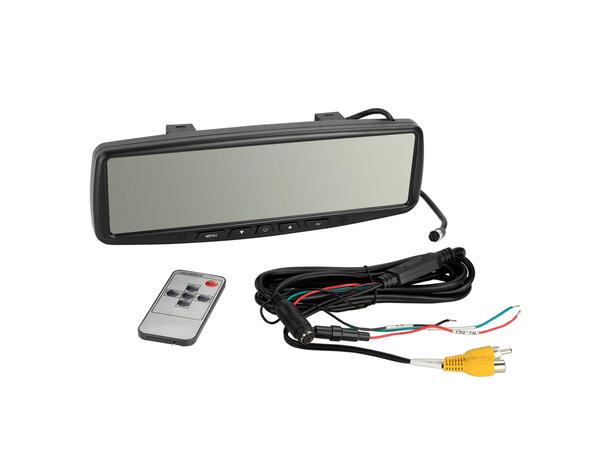 4,3" skjerm innfelt i robust sladrespeil som festes over bilens originale. Betjenes ved hjelp av medfølgende fjernkontroll.