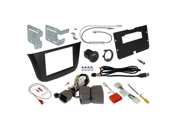 Settet inneholder spesialtilpasset rammer og braketter, samt kabeloverganger for antenne og strøm med CAN adapter. Sistnevnte ivaretar også rattkontroll funksjonene.