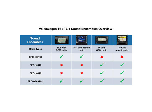 Alle nødvendige installasjonsbraketter og kabelseler er inkludert i SPC-W84AT6-2-settet for å muliggjøre en smidig og enkel installasjon. Denne versjonen inkluderer et plug-and-play-ledningsnett for å koble lydanlegget til en original Volkswagen T6.1/T6-radio eller ettermarkedsradioer med RCA-forforsterkerutganger.