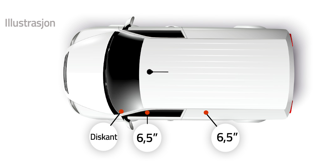 Det er plass til 6,5" (16,5cm) høyttalersett i framdøren. Her kan du bruke spesialtilpassede høyttaler sett eller universale med en høyttaleradapter.