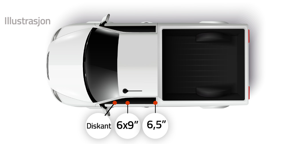 Det er plass til 6x9" høyttalersett i framdøren. Her kan du bruke spesialtilpassede høyttaler sett eller universale med en høyttaleradapter.