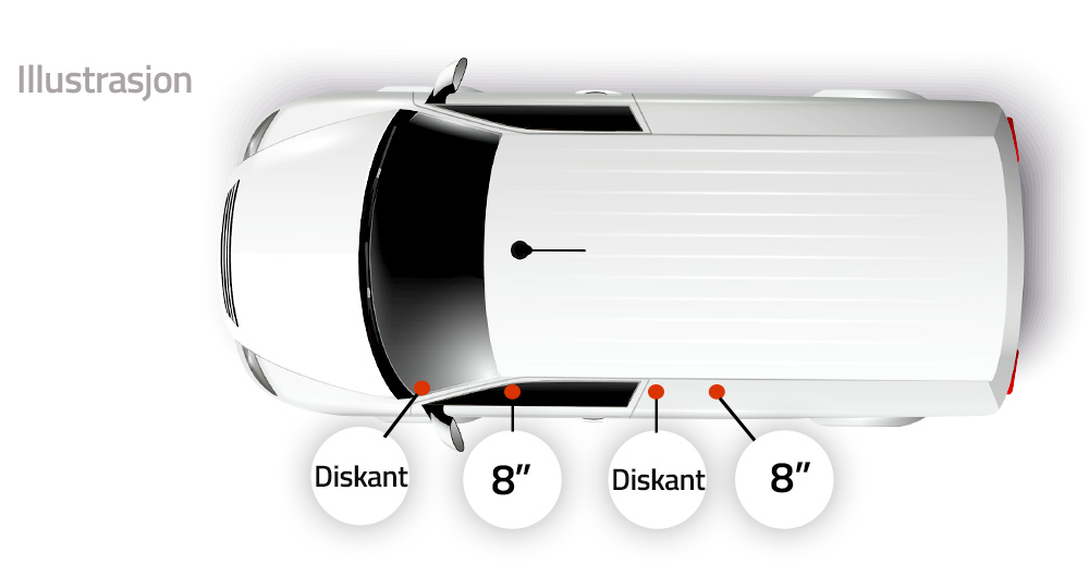 Det er plass til 8" (20cm) høyttalersett i framdøren. Her kan du bruke spesialtilpassede høyttaler sett eller universale med en høyttaleradapter.