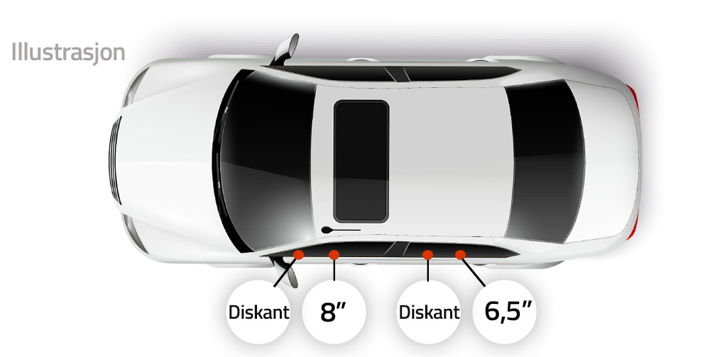 Det er plass til 20cm høyttalersett i framdørene. Her kan du bruke spesialtilpassede høyttalersett eller universale med høyttaleradaptere.
