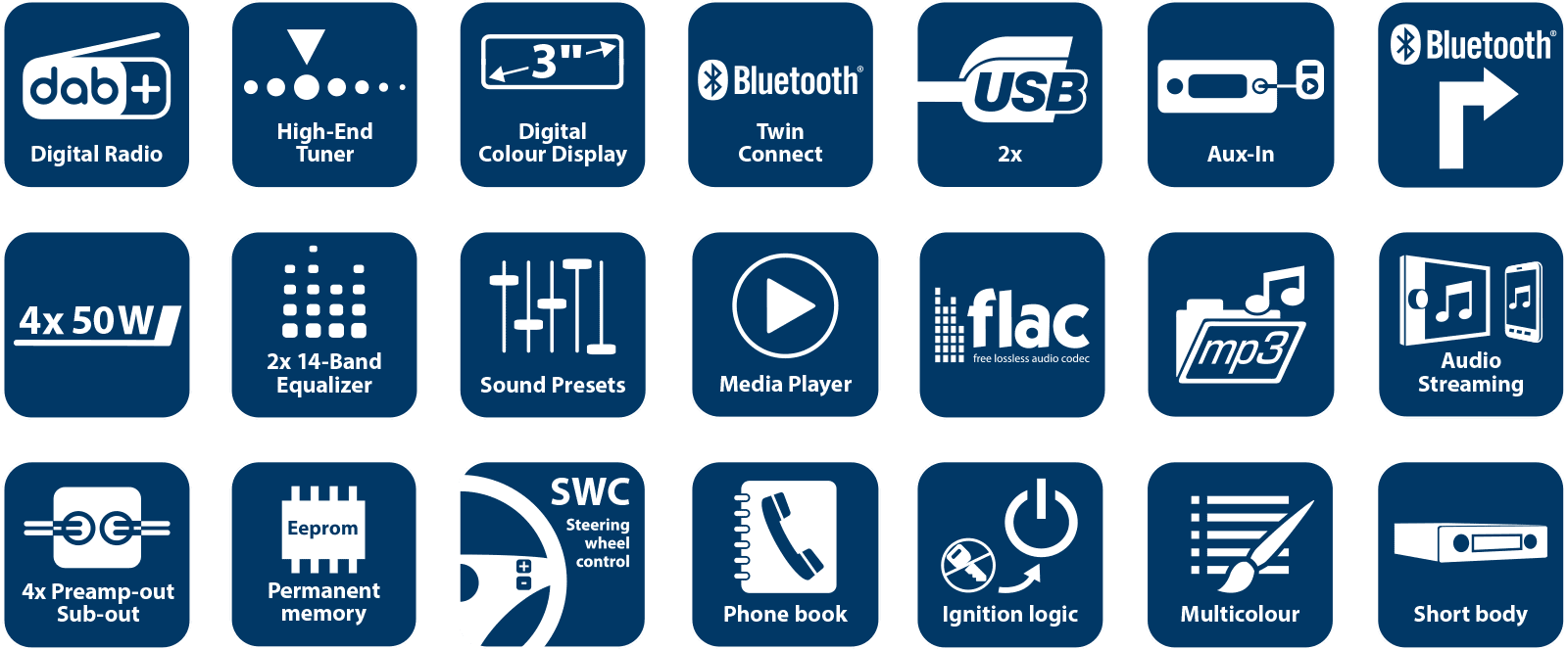 Bilradio fra 70-tallet i ny utgave med 3" digital fargeskjerm, DAB+ og Codem IV high-end tuner, Bluetooth Twin Connect, USB, AUX.