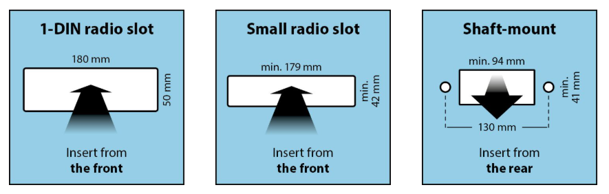 Enheten kan monteres i ulike dashbordåpninger. For eksempel følger det med monteringsmateriell for akselmontering og 1-DIN monteringsspor.