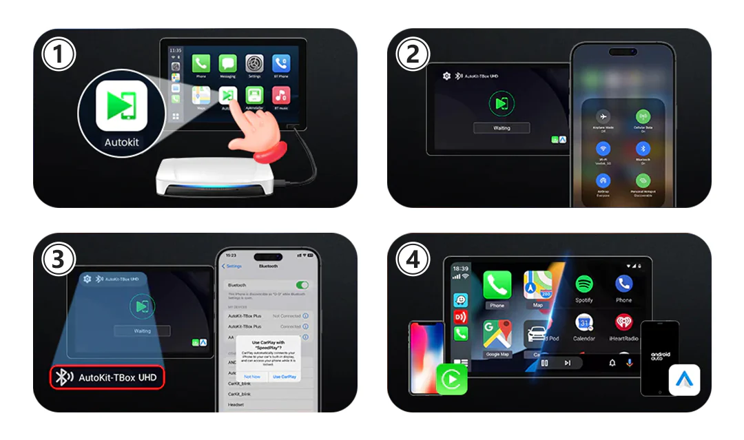Med Tbox Ultra kan du koble iPhone eller Android-telefonen trådløst til bilens skjerm. Nyt håndfri samtaler, navigasjon, musikk og meldinger uten kabelrot. Bruk enkelt SIM-kortnålen til å holde inne Tbox Ultra-knappen i noen sekunder for å bytte mellom Apple CarPlay og Android Auto.