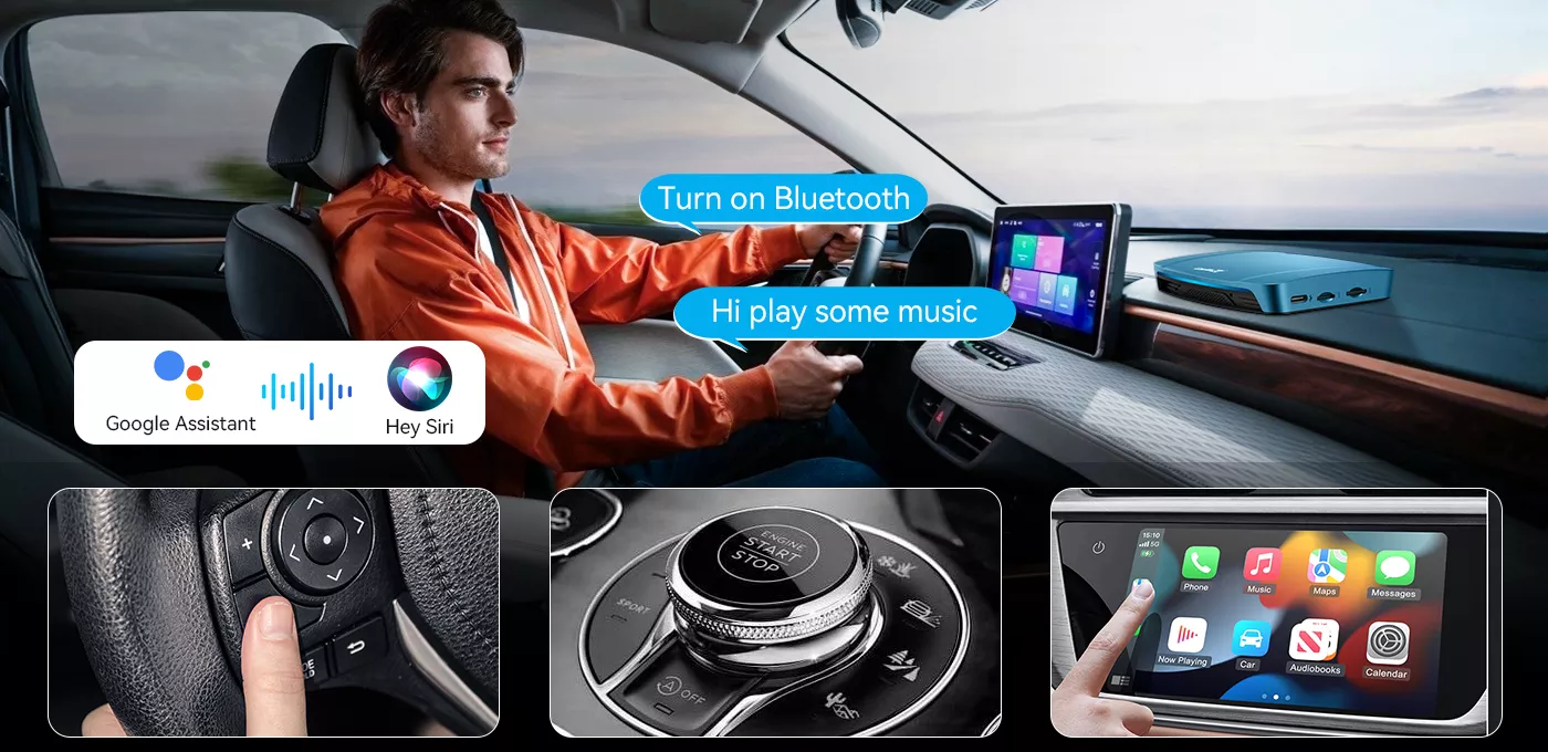 Tbox Ultra fungerer sømløst med bilens originale infotainmentsystem, slik at du beholder alle fabrikkfunksjoner. Du kan fortsatt bruke Siri, rattkontroller og originale knapper eller langttrykksfunksjoner, samtidig som du nyter trådløs CarPlay, Android Auto og Android-apper. Dette sikrer en intuitiv opplevelse uten å påvirke bilens opprinnelige kontroller.