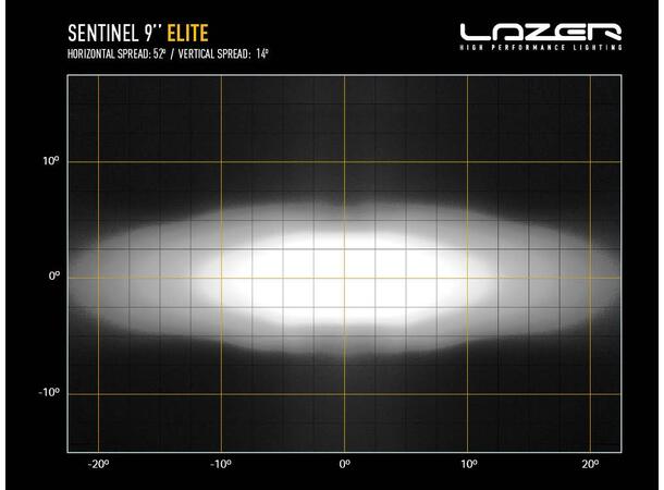 Med en lysstyrke på 15232 ekte lumen, leverer lampene 1 lux på 742 meter, men det er i den 52 graders horisontale lysfordelingen og synligheten på sidene av veien eller banen i middels til lang rekkevidde at Sentinel Elite virkelig kommer til sin rett. Som alle Lazer-produkter er fargetemperaturen på behagelige 5000K som er lett for øyet, samtidig som skarpheten og definisjonen av objekter foran blir maksimert. Lampen er UNECE-godkjent i henhold til forskrift 112 som fjernlys, gjennom bruk av Lazers dual output Boost-teknologi; kontrollert via raskt blink med fjernlys kan lampen raskt dimmes for å unngå blending når du passerer veiskilt for eksempel, eller når som helst programmeres til å alltid fungere i høy- eller laveffektmodus, med laveffektmodus er lampen godkjent i henhold til UNECE Reg112 som fjernlys.