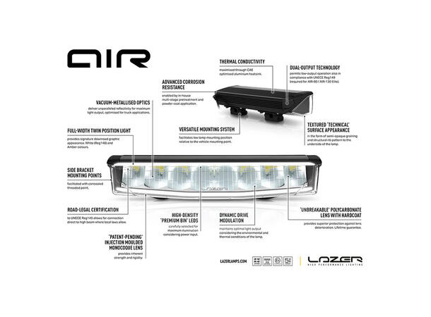 Vi introduserer AIR, Lazer Lamps nyeste serie med LED-barer spesielt designet og konstruert med markedet for tunge lastebiler og nyttekjøretøy i tankene. Innenfor serien er 3 varianter av lampen: AIR-55, AIR-90 og AIR-130 Elite, med den numeriske verdien som representerer strømforbruket til hver lampe.