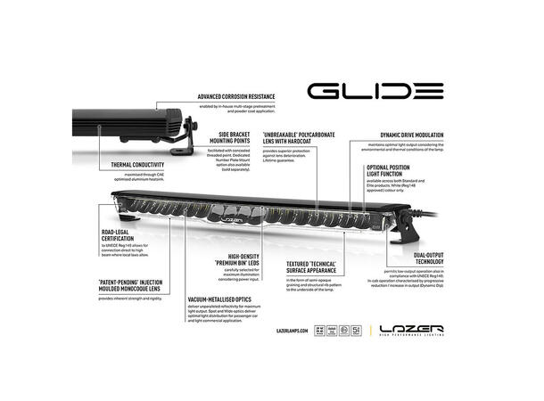 Glide Elite, verdens første "formede" LED-bar. Med en unik støpt linsekonstruksjon for svært vekteffektiv styrke og robusthet, er Glide en serie med 20" buede ledbarer som leverer så mye mer, spesielt når man vurderer deres ultralavprofilerte design. Den unike balansen mellom eksepsjonell lysytelse og utseende, som er godt egnet med fronten til en rekke kjøretøytyper, merker og modeller, gjør Glide til et eksepsjonelt valg, spesielt innen personbil- og lette kommersielle sektorer.