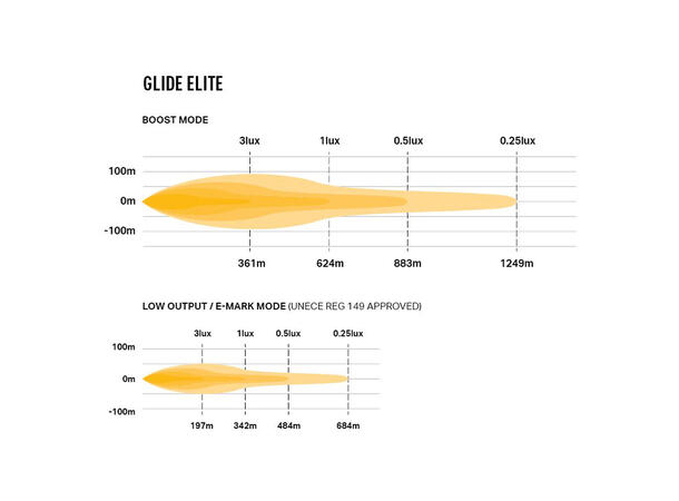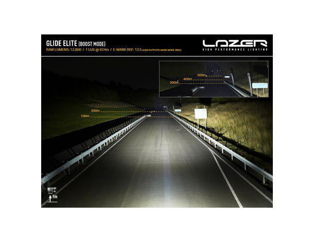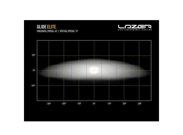 Ethvert produkt fra Lazer med "Elite" merket leverer de aller høyeste nivåene av lyseffekt i en nøye konstruert strålefordeling fra en kombinasjon av Spot- og Wide-optikk. Denne typen optikk, vakuummetallisert internt av Lazer for å maksimere reflektiviteten, utnytter de 12800 ekte lumenene for å levere 1 lux på 624 meter samtidig som den opprettholder en 66 graders horisontal spredning av lys. Premium LED-pærene som brukes i Glide Elite-lampene er nøye utvalgt for deres 80CRI, denne høye fargegjengivelses gir mer definisjon av farger for en klarere og tryggere kjøreopplevelse om natten.