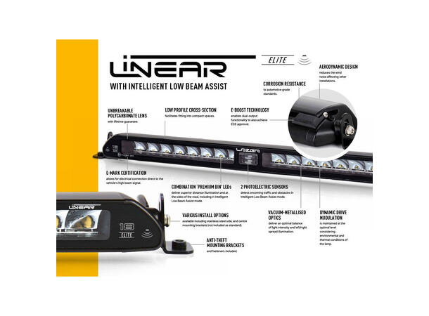 Lazer Linear 18 Elite har lenge vært den mest populære lampen til Lazer, og med god grunn. Med denne nye versjonen øker Lazer lysstyrken til hele 18000 lumen og kastelengden til over en kilometer, men beholder størrelsen, designet og det gode lysbildet Linear 18 er kjent for. Men det viktigste tilskuddet er den innovative og markedsledende teknologien, Intelligent nærlysassistent.