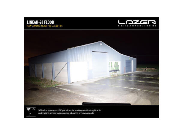 Lazer Linear 24 Flood har en unik optikk man kun finner i denne lampen. Lyset er fokusert på området du jobber på. Det gir mindre strølys opp i tretoppene og forstyrrer mindre for andre arbeidende på anleggsområdet. Lampen har stor og jevn spredning av lyset, for god sikt over hele arbeidsområdet. Med en fantastisk lysstyrke på hele 16200 lumen får du et fantastisk arbeidslys, selv på de største anleggsmaskinene.