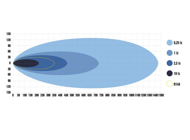 Kastelengde: 1Lux ved 727 meter, 0,25Lux ved 1454 meter